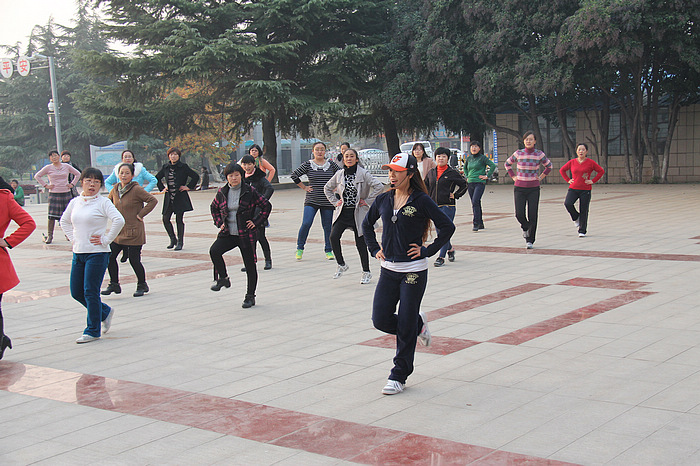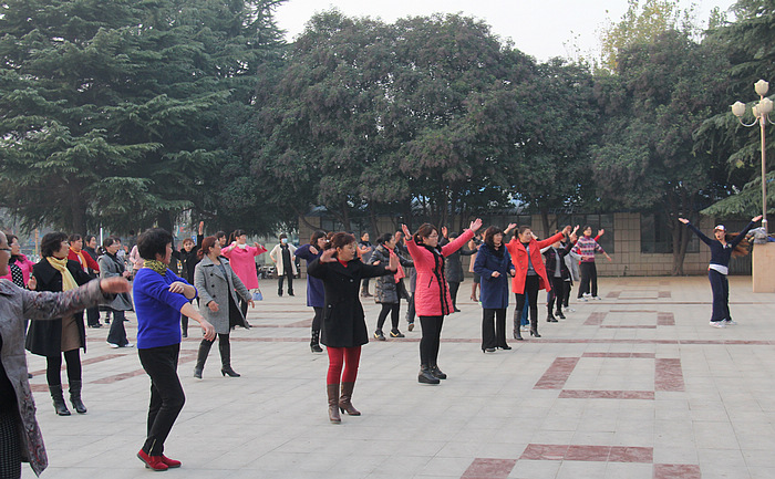 14日下午,活动正式启动。女教职工们纷纷来到学校文化中心前广场,和着轻快的音乐,伴着动感的节奏,在基础部李桂华老师的指导下,有板有眼的练习起来。