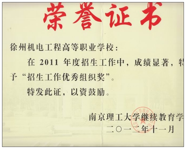 2012年11月8日,在浙江温州函授站工作会议上,南京理工大学授予我校2011年度”招生工作优秀组织奖”。