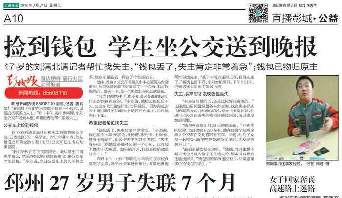 《彭城晚报》于3月31日在A10版刊发了题为《捡到钱包 学生坐公交送到晚报》的新闻,对刘清北同学拾金不昧的精神给予大力赞扬。
