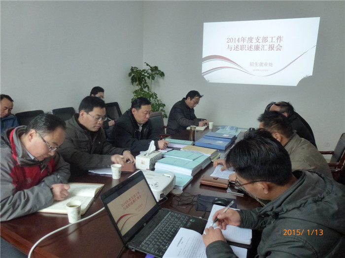 2015年1月13日下午,校党委书记孙健身带领校长助理、组织人事处处长王体民、纪检监察室副主任刘军、学生处处长黄清站、组织人事处陈晓波同志对招生就业处党支部2014年度工作进行考核检查。