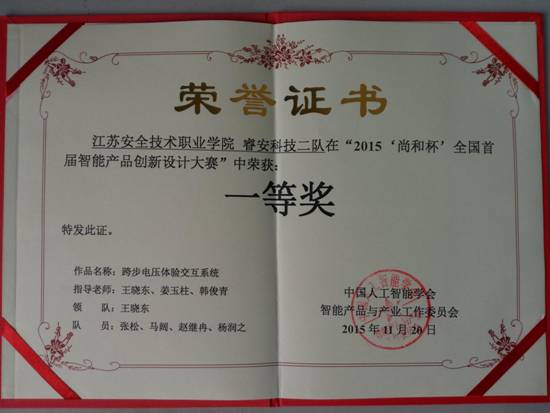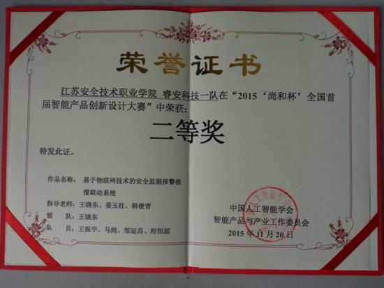 我校电气工程系机器人创新实验室的两个作品《跨步电压体验交互系统》和《基于物联网技术的安全监测报警救援联动系统》参与了中国智能产品创新设计大赛,参赛队分别是睿安科技一队和睿安科技二队,选手为12高职机电3班王振宇、13高职机电2班马阔、13高职机电2班邹运昌、13高职机电2班相恒超,11高职机电1班张松、13高职机电2班赵继冉、13高职机电2班杨润之。两个团队作品分别荣获金牌和银牌。