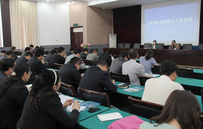 4月15日下午,学校在办公楼四楼会议室召开2014年全校招生工作会议。参加招生工作的单位负责人、全体招生工作人员参加会议。会议由招生就业处张允志主任主持。