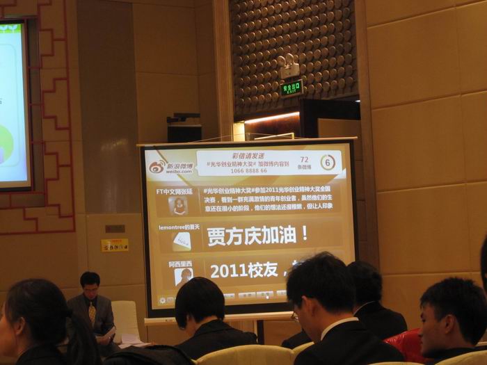 现场观众通过新浪微博向我校选手贾方庆同学表示鼓励↑
