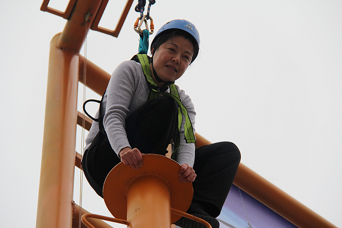 薛莲副校长巾帼不让须眉,率先完成所有项目。她说,挑战训练之前总认为自己完不成任务,“比如高空抓杆项目,我一直认为自己够不着横杆,但是上到高空之后发现根本没有自己想象的难。”希望教职工们在将来的工作中不要被困难吓退,“不勇敢地试一下,你不会知道自己的强大。”