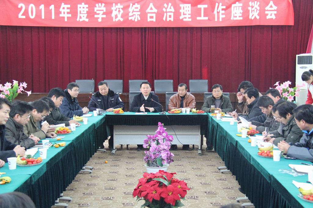 为认真贯彻落实中央社会管理综合治理会议精神,总结2011年综治工作,谋划好2012年度综治工作,12月22日,学校2011年度综合治理座谈会在校办公楼四楼会议室举行。校党委书记孙健身,校长助理、工会主席成伯君,以及学校各基层单位负责人参加了此次会议。贾汪区政法委郑友亮主任、贾汪区公安局高钦华科长应邀出席此次会议。