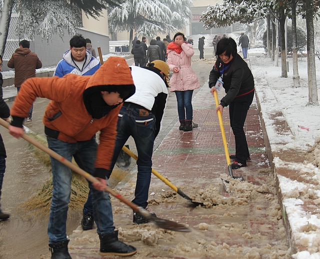 为确保路面清洁畅通,防止师生摔伤,上午,我校各系学生在系领导和班主任的组织和带领下组成一支庞大扫雪队伍,利用上午大课间的时间对校园各教学楼前道路以及学校主干道上的积雪进行了清扫。他们扫、铲、推,忙碌的身影活跃在校园的各个角落,“积极踊跃抢争先,雪花飘飘不觉寒”是广大师生员工的真实写照。