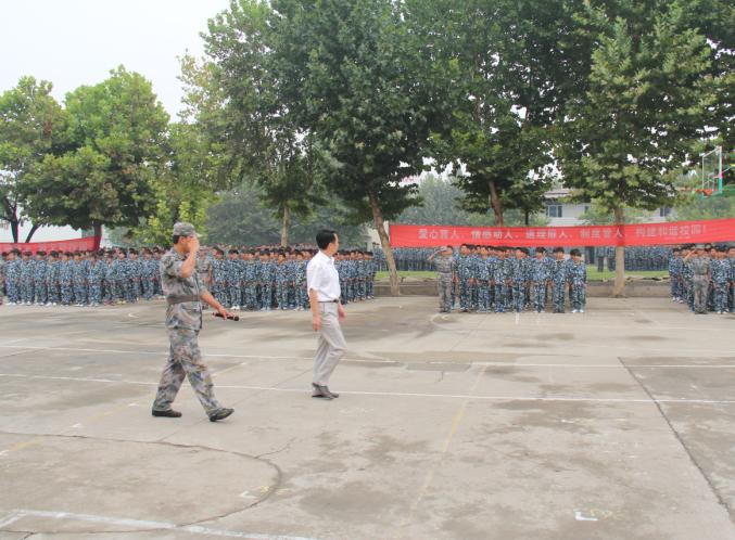 大会开始,全体起立,庄严的国歌声响彻整个校园。之后,在嘹亮的军歌声中,三位旗手高举国旗迈着矫健的步伐进入大家的眼帘,旗手精神饱满,国旗迎风飘扬,接着校党委孙书记对军训方队进行了检阅,阅兵式正式开始,红旗方队及各方队的同学喊着洪亮的口号步入主席台前接受领导检阅,他们着装整齐,正步走过主席台前,台上发出阵阵掌声。