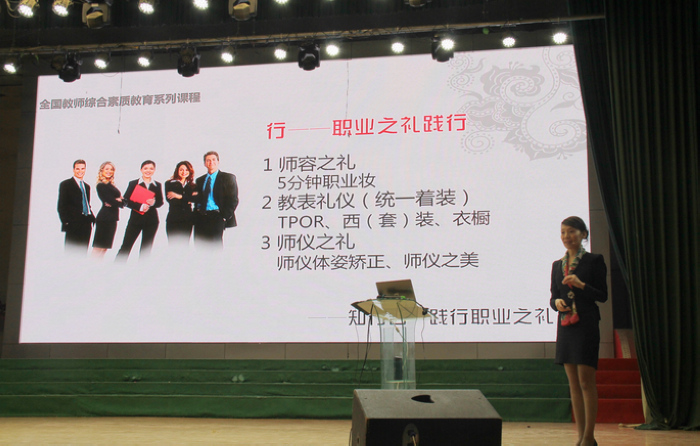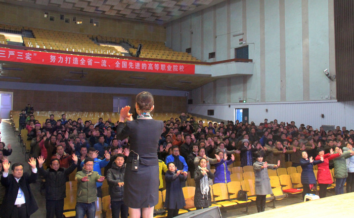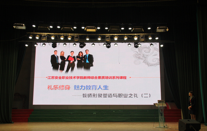 12月4日下午,江苏开放大学国家精品课程获得者、高级礼仪培训师、人文教育博士赵岩副教授再次应邀来校,开展了以“礼乐修身,魅力教育人生——教师形象塑造与职业之礼”为题的培训讲座。讲座由宣传部长于孝忠主持,全校教职工近500人听取了讲座。