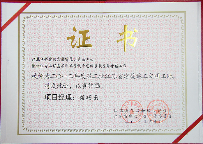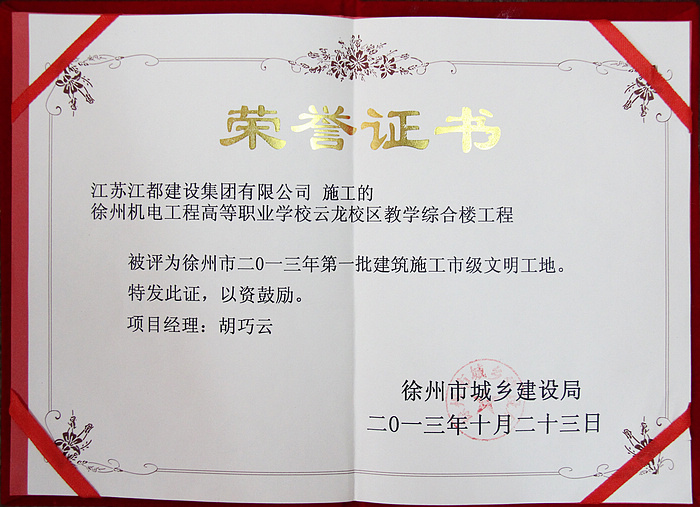 我校云龙校区教学综合楼工程,自开工以来,在施工过程中严格遵守规范、按图施工、严抓质量安全,做到高标准、严要求。确定了安全标准化工地的管理目标,现场管理规范化。 在各级建设行政主管部门、质量安全监督机构的具体组织实施和建设单位、施工企业、监理企业的共同努力下,经专家现场考核、省级文明工地审定委员会审定,并公示无异议后,荣获“江苏省建筑施工文明工地”称号。 后勤管理处 朱路