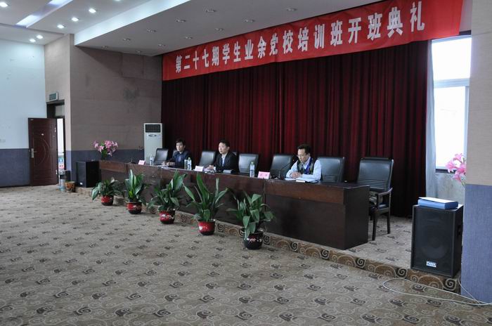 4月8日下午4:00,我校第二十七期学生业余党校开班典礼在机关楼四楼会议室如期举行。校党委书记孙健身、组织人事处处长邓守林和团委副书记刘麟出席了此次典礼。来自我校五系、学生会,记者团124名品学兼优的党校新学员参加了本次培训班。
