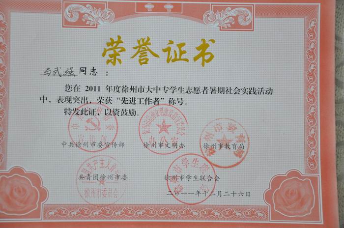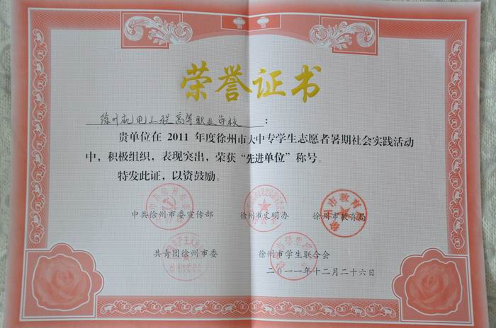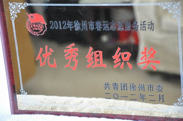 为表彰我校在2012年徐州市“助人乐己 爱心传递”春运志愿者服务活动中所做出的突出贡献,我校获得由团市委颁发的2012年徐州市春运志愿者服务活动“优秀组织奖”,同时马武强老师获“先进工作者”称号,许勇、李旭两名同学获社会实践“先进个人”称号,田宝琪、陈聪等13名同学获得“优秀春运志愿者”称号。
