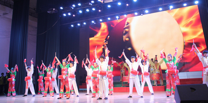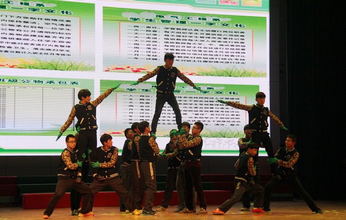 在学校腰鼓队精彩的开场舞后,系部文化展演节目正式上演。安全工程系同学带来的节目《开采太阳》结合了快板、舞蹈等多种艺术形式,既表现了系部文化又突出了新疆班的民族特色。电气工程系《“一”字育人》融入了电气工程系特有的“一” 字文化和育人理念,同时特色系操“小苹果”给观众留下深刻印象。机械工程系创意节目《校园一日游》以学生的一天生活为主线,从学生的视角表现了学生管理理念,“现场焊天衣”等表演别出心裁,引人入胜。数控技术系的节目《精雕细琢缔造梦想摇篮》把育人理念与传统文化相结合,具有浓郁中国风的扇子舞令人眼前一亮。信息工程系的节目集中表现了该系“操炼人生”特色文化,其中军体拳、青春韵律操展示了我校学生健康活泼、积极向上的精神风貌。展演节目既突出了各系的特色文化,又融入了各系不同的教学和育人理念,丰富的表演形式也体现了各系团总支的社团活动正在如火如荼开展。