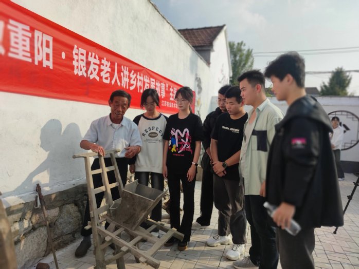 邳州市碾庄镇才庄村一群银发老人以木质平板车、耩娄、木制风箱、犁、等老式农具向大中小学生讲述乡村发展、农业劳动工具变化以及人们生活水平的提升�