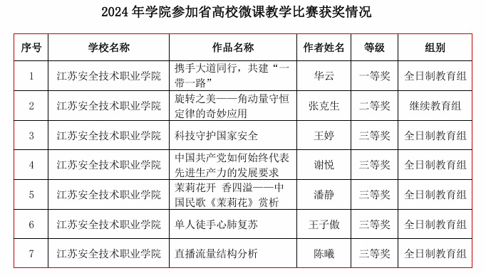 近日�2024年江苏省高校微课教学比赛获奖名单公布,我�7项作品获奖,其中一等奖1项,二等�1项,三等�5项,获奖数量再创学院新高�