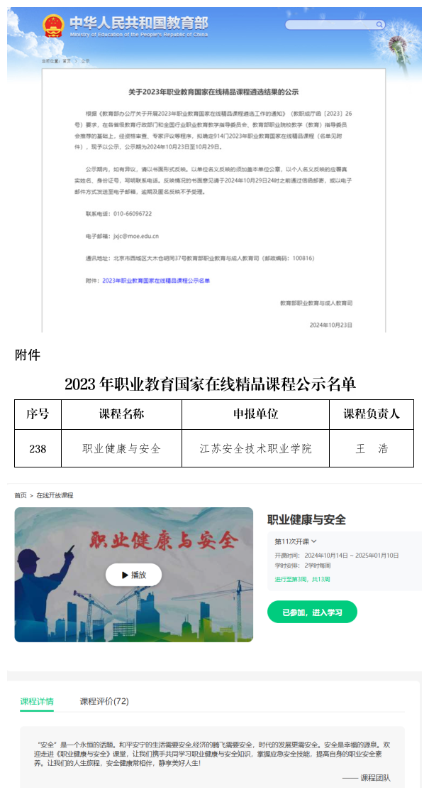 近日,教育部发布《关�2023年职业教育国家在线精品课程遴选结果的公示》,我校工业安全与职业健康学院王浩教授主持的《职业健康与安全》课程成功入选�2023年职业教育国家在线精品课程”,实现了我校国家级精品在线开放课程上“零的突破”�