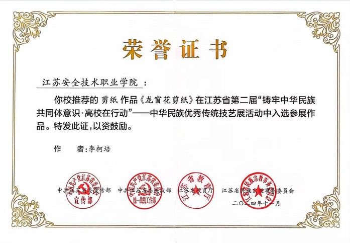 由江苏省委宣传部、江苏省委统战部、江苏省教育厅、江苏省民宗委主办的第二届“铸牢中华民族共同体意识·高校在行动”之中华民族优秀传统技艺展,组委会从全省高校选送的877件作品中遴选出176件优秀作品入围展览,我校共征集各类别艺术作�56件,评选报�9件,其中,商贸与人文学院23婴托4班李柯培同学的作品《龙窗花剪纸》入选优秀文化技艺展�