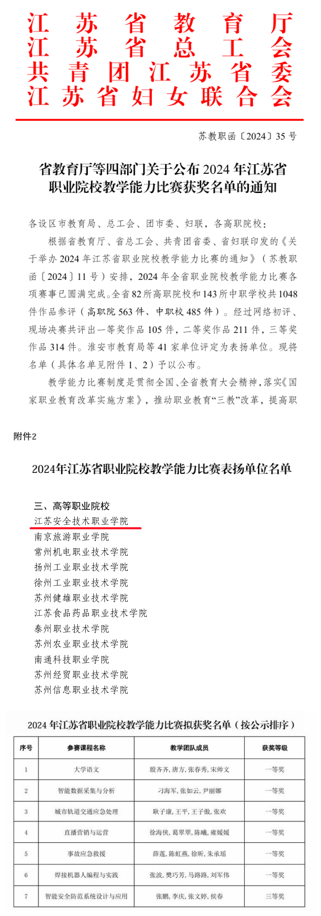近日,江苏省教育厅等四部门联合发布了《省教育厅等四部门关于公�2024年江苏省职业院校教学能力比赛获奖名单的通知》(苏教职函�2024�35号)�2024年,学校7支参赛团队表现优异,荣获一等奖6项、三等奖1项,获奖�100%,一等奖数量和总积分均居全省第一名,再创历史新高�