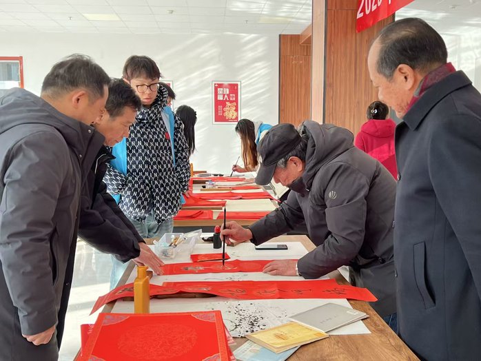 教职工书画社团成员及退休教职工书法爱好者们齐聚一堂,他们饱蘸墨汁,笔走龙蛇,一幅幅饱含深情与祝福的春联跃然纸上。师生们踊跃参与其中,大家或是驻足欣赏书法创作,或是挑选心仪的春联,准备将这份带着墨香的祝福带回宿舍、家中。现场墨香四溢,喜庆的氛围感染着每一个人。“红梅傲雪千门福,绿柳迎春万户新”等寓意美好的春联,不仅展现了书法艺术的魅力,更寄托着对新的一年的美好期盼�