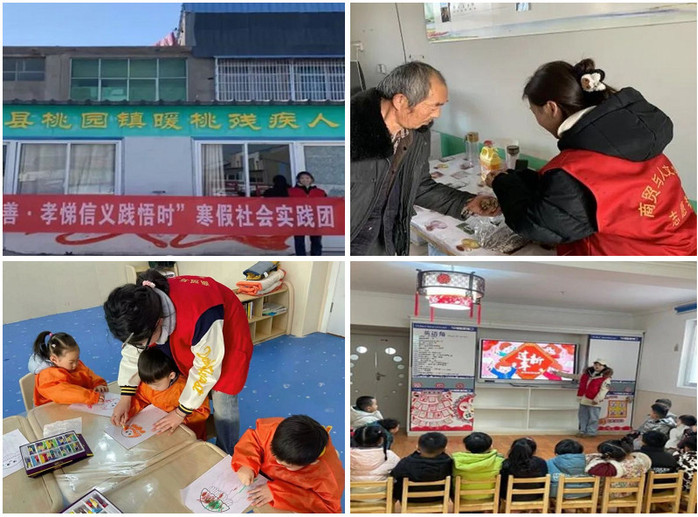 商贸与人文学院“崇德尚善・孝悌信义践悟时”寒假社会实践团第一站到达了睢宁县桃园镇暖桃残疾人之家,为老人们带去了精心准备的礼物,还为老人打扫卫生,扫地、擦桌子、拖地等;实践团在家乡社区开展“悌行邻里”儿童关爱活动,现场教孩子们包饺子、绘画、做手工,在他们心中种下了“悌”的种子;走入商业街区,开?“诚信经营,从我做起”的宣传活动;队员们还前往当地乡村地区的幼儿园进行支教,开展关于过年的手工活动和新年课程,帮助幼儿拓宽视野、增长知识?/p>