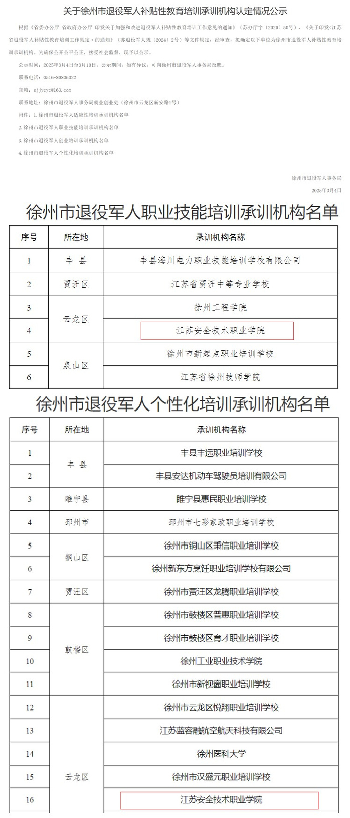 近日,徐州市退役军人补贴性教育培训承训机构认定情况公示,我校成功入选。这一成果标志着学校在退役军人职业技能提升与就业创业支持方面迈出了坚实的一步,将为徐州市退役军人教育培训事业的高质量发展提供有力支撑�