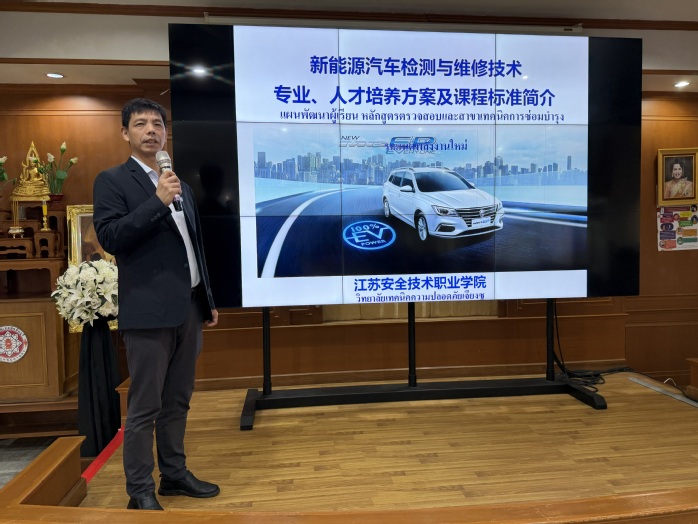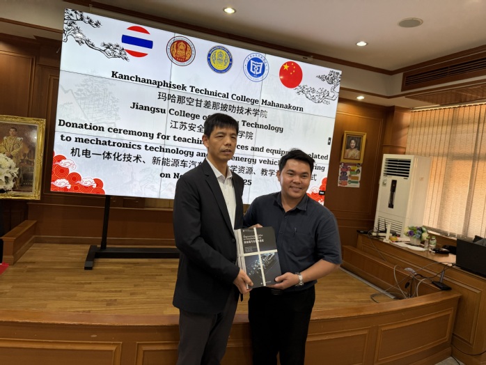 在揭牌仪式上,中泰双方共建专业教材发布,我校出访团向与会泰方院校代表详细介绍了机电类、汽车类专业课程标准建设情况并进行相关研讨,现场还赠送了教材等教学资源,捐赠了由教师自主制作的传感器等教学设备,首次实现了课程标准、教学资源、教学设备系统化整体化输出�?/span>