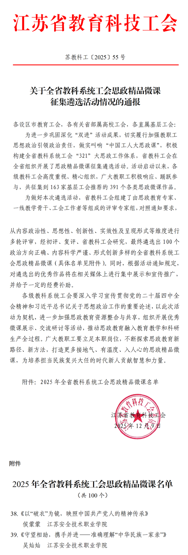 近日,江苏省教育科技工会公布全省教科系统工会思政精品微课征集遴选活动结果,我校工会选送的两项作品从391参赛作品中脱颖而出,成功入选全省100 个思政精品微课名单,斩获佳绩。其中,侯蒙蒙老师的作品《以 破衣为镜,映照中国共产党人的精神传承》、吴灿灿老师的作品《守望相助,携手并进 —— 准确理解 中华民族一家亲》凭借鲜明的政治导向、深刻的思想内涵和生动的呈现形式,得到评审专家组的一致认可。