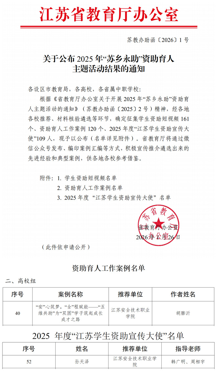 近日,江苏省教育厅下发《关于公�2025年“苏乡永助”资助育人主题活动结果的通知》(苏教办助函�2026�1号)。我校喜获两项荣誉。其中,工业安全与职业健康学院辅导员胡膨沂老师的案例《“安”心筑梦,“全”程赋能——“五维共助”为“双困”学子筑起成长成才之路》获评“资助育人工作案例”;智能制造与应急装备学院韩广明、周相宇老师指导的学生孙天泽荣获“江苏学生资助宣传大使”称号�