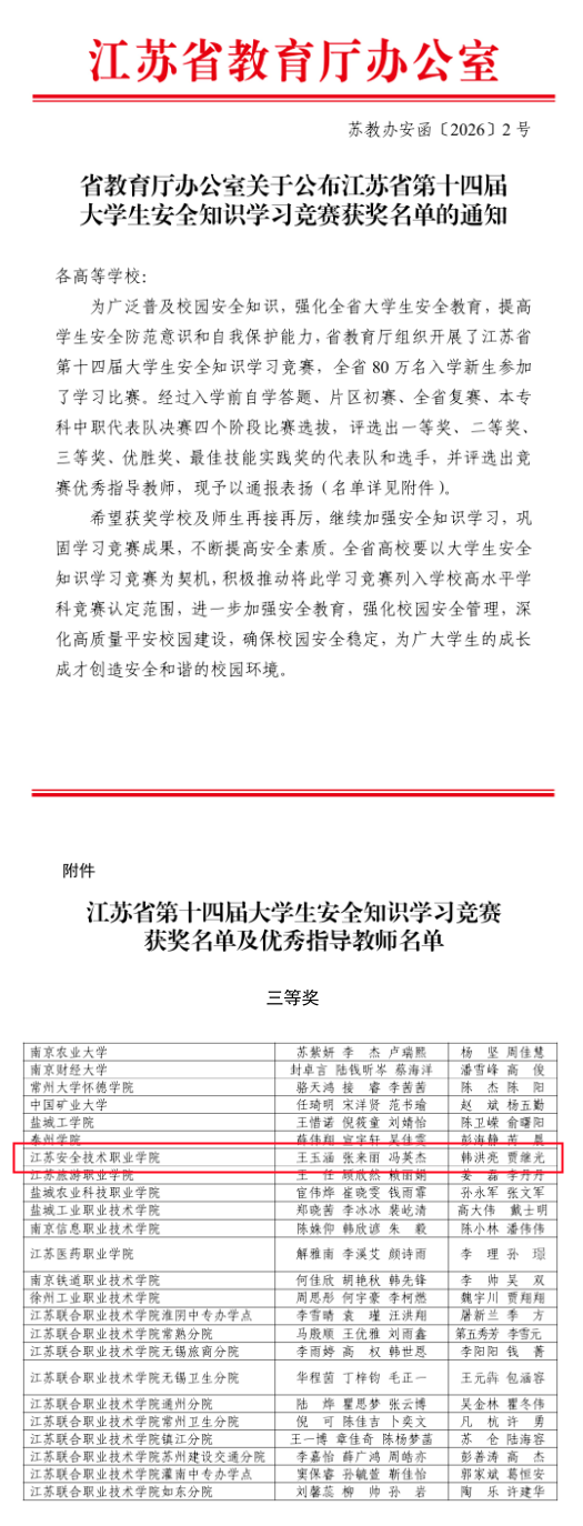 近日,由江苏省教育厅主办、江苏省高等教育学会保卫研究会承办的江苏省第十四届大学生安全知识竞赛决赛落下帷幕。我校商贸与人文学院王玉涵、冯英杰、张来丽等三名同学组成的代表队荣获省赛三等奖(专科组第七名),韩洪亮、贾继光两位老师获评“优秀指导教师”。