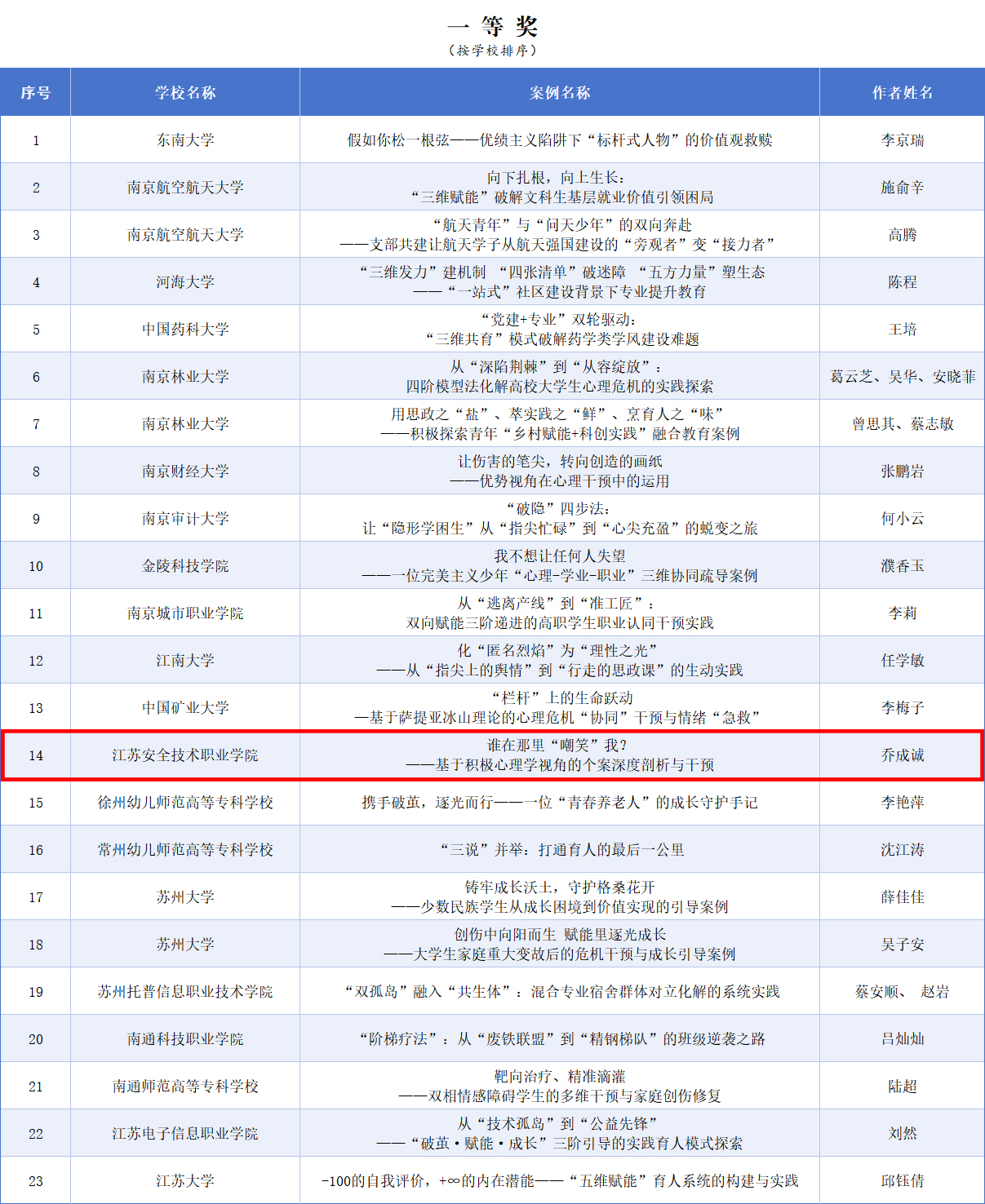 近日,江苏省高等教育学会辅导员工作研究委员会公布了2025年全省高校辅导员工作案例评选结果,我校辅导员乔成诚老师撰写的案例《谁在那里“嘲笑”我?——基于积极心理学视角的个案深度剖析与干预》荣获一等奖,实现在该项目上的新突破。