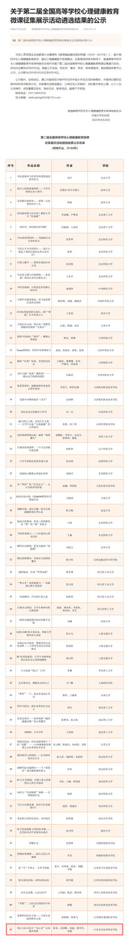 此次作品入选是我校心理健康教育工作成果的一次集中展示,也是我校重视心理育人、加强师资队伍建设的具体体现。下一步,学校将以此次入选为契机,持续深耕心理健康教育领域,不断探索心理育人新路径、新载体,打磨更多优质心理健康教育资源,切实提升心理育人实效,为学生健康成长保驾护航。
