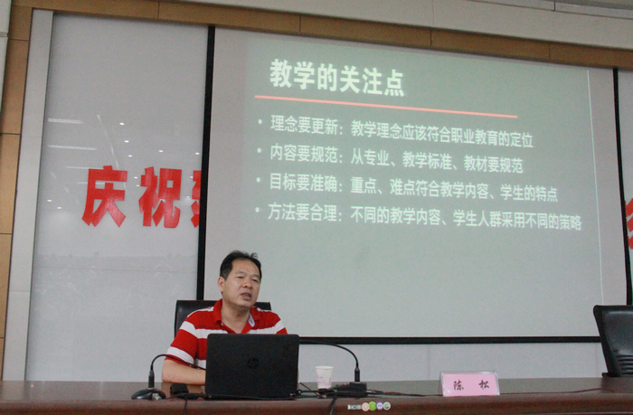 上午,陈松教授就信息技术的发展、教学中渗透信息技术的方法和技巧、信息化教学比赛内涵等三个方面为教师们进行讲解,指出教育部希望职业教育战线形成学生有技能大赛,教师有信息化教学大赛的两赛格局,以促进教师在信息化环境下教学水平的提升,又详细介绍了了信息化教学设计、信息化实训教学的比赛要求,以获奖作品为案例,解读相应评分标准以及备赛要求。