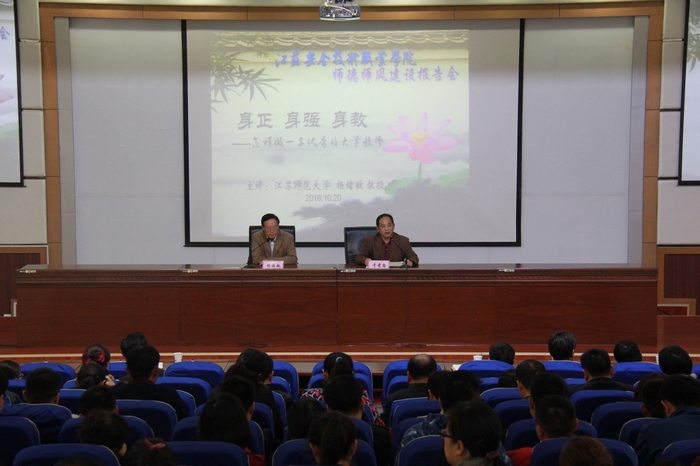 为进一步加强学院师德师风建设,提升教师职业道德素养?span>10?span>20日,我院邀请江苏师范大学杨绪敏教授为全院教师作师德师风专题讲座。讲座由党委宣传部于孝忠部长主持?/span>