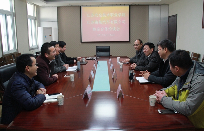 3�19日,江苏路航汽车有限公司领导平响响、史先至,徐矿大学领导卢信昌、沈荣来我校洽谈合作事宜。校领导徐建春、任国兴,招生就业处领导张允志、乔骋出席会议�