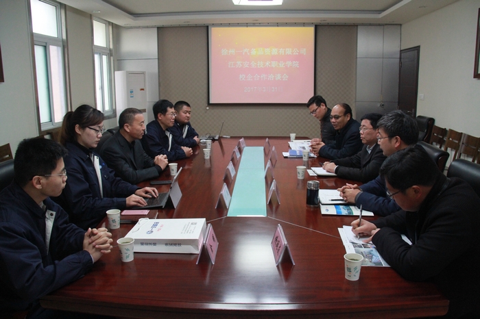 3�31日,徐州一汽备品资源有限公司董事长闫久纀总工程师王永士、商务助理陈熙、总监高立启、运营总监金明一行五人来我校洽谈合作事宜。校领导徐建春、任国兴,招生就业处处长张允志、数控技术系主任陈子银、汽车工程系主任佟廷友出席会议�