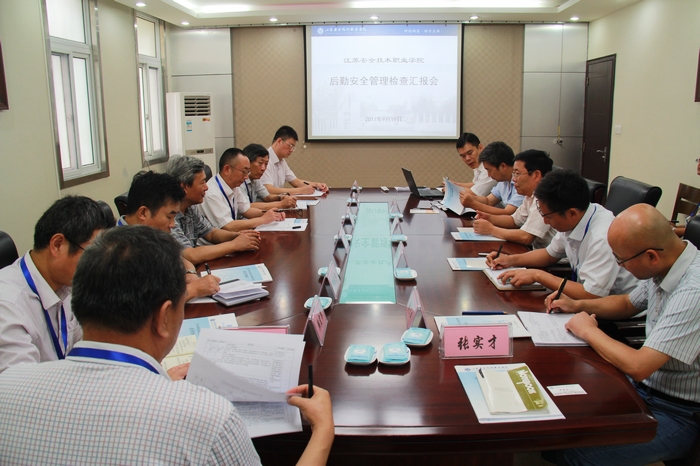 9�19日,江苏省高校后勤安全管理第十六检查组一�9人来我院检查工作。专家们对我院学生餐厅、学生公寓、医务室、配电室、超市等逐一进行检查,认真查阅我院后勤安全管理工作台账,听取了后勤安全工作汇报,对我院后勤安全工作给予充分肯定。院长徐建春、副院长吴如根、副院长任国兴出席汇报会�
