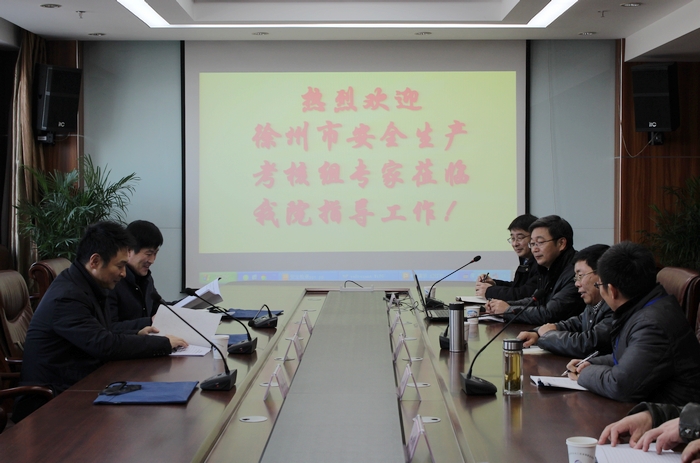 12�25�下午,徐州市安监局新城分局局长洪强、市安监局办公室董加文主任等一行两人组成的市安全生产考核组来我校,进�2017年度安全生产工作考核和督查。院长徐建春、副院长吴如根、副院长任国兴出席考核汇报会,保卫处、总务处、后勤管理处等有关部门负责人参加了会议�