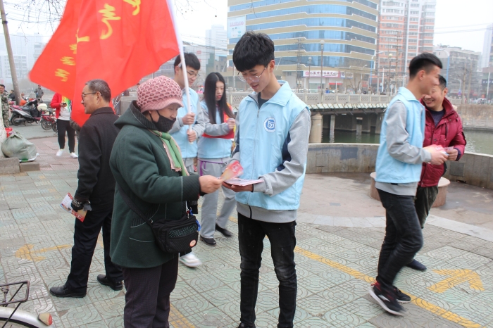 电气工程系组织志愿者在故黄河畔向市民发放雷锋精神宣传册,讲述雷锋事迹,演唱学雷锋歌曲�