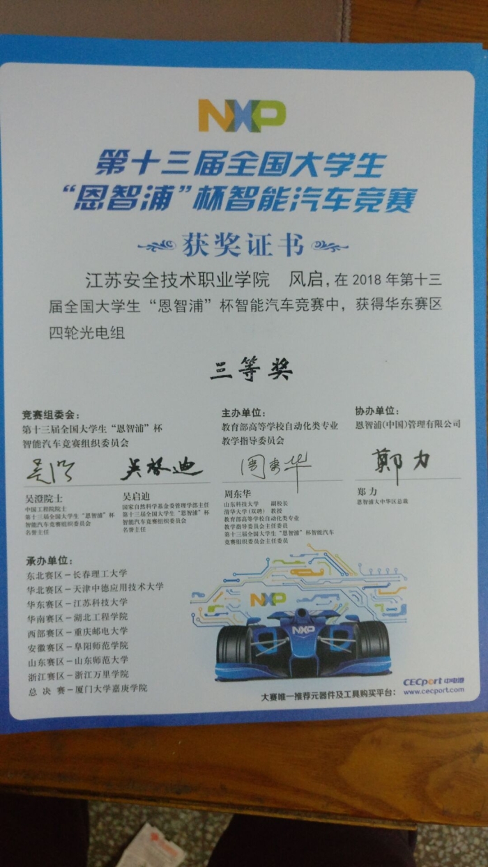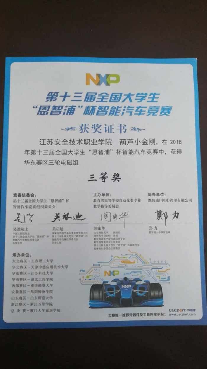 大学生智能车竞赛是教育部官方保留�19个大赛项目之一,本次比赛由教育部高等学校自动化专业指导委员会主办,江苏科技大学承办。大赛分为四轮光电、三轮电磁、两轮直立、无限节能、信标对抗、双车会车等6个项目。电气工程系领导集体高度重视,选拔宋陆昊、朱帅帅两位老师指导“风启”、“葫芦小金刚”团队分别参加四轮光电和电磁三轮组比赛。这是我院首次参加本项目,面对众多本科院校选手,竞争异常激烈。我�14高职电气自动化班陈勇成、王志成、刘洋、周文迪、绕本军、杜威六名参赛选手不畏强敌、沉着应战、克服困难,战胜20多所本专科院校选手,两支队伍双双荣获三等奖�