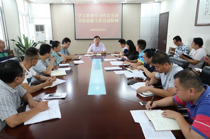 8�30日上午,学工系统在机关楼二楼会议室学习传达全国宣传思想工作会议精神。党委副书记孙健身传达了会议精神主要内容,学工处负责人、团委负责人、各系部学管主任、学管组长、部分辅导员、少数民族教师代表等参加了学习会议�