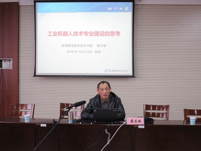 12�18日下午,常州机电职业技术学院电气工程学院院长蒋庆斌教授应邀到我院开展工业机器人技术专业建设指导。我院教务处处长杜宗辉、电气工程系党支部书记丁得果、主任王郝及电气工程系全体教师参加了学习交流会�
