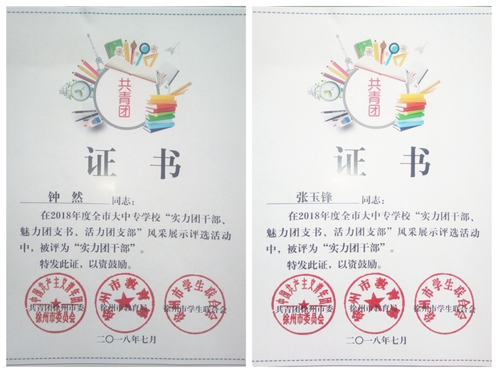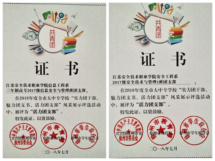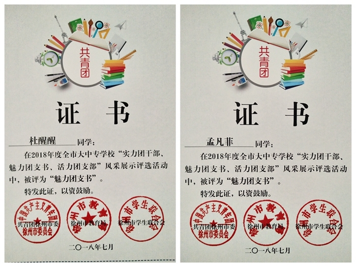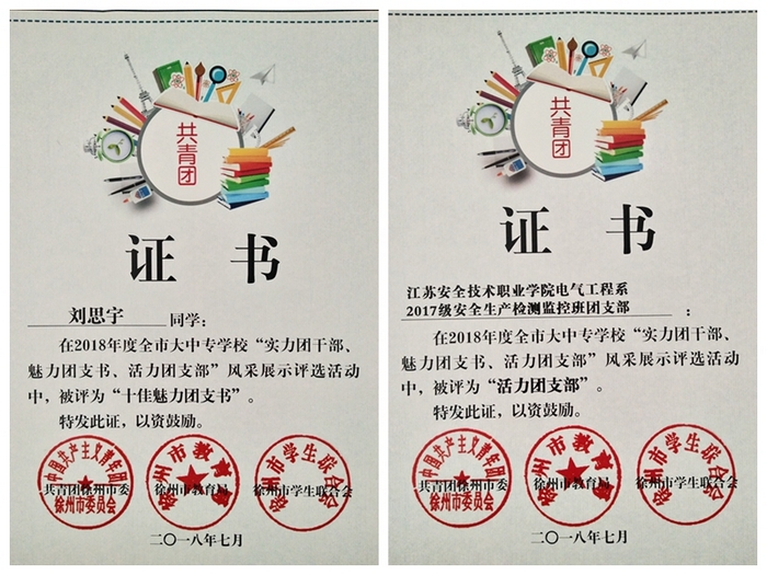 近日,由共青团徐州市委主办的2018年度徐州市大中专学校“魅力团支书”“活力团支部”“实力团干部”风采展示评选结果公布,我院团委推报�8个项目荣获有关奖项。其中,信息系刘思宇同学荣获徐州市“十佳魅力团支书”称号,汽车系杜醒醒、机械系孟凡�2位同学荣获徐州市“魅力团支书”称号;2017级安全生产监测监控班团支部�2017级安全技术与管理1班�2017级信息安全与管理班团支部3个团支部荣获徐州市“活力团支部”;钟然、张玉锋2位老师荣获徐州市“实力团干部”�