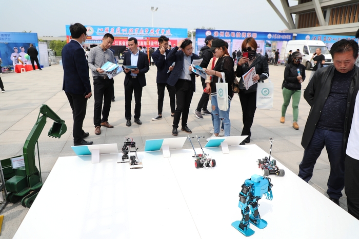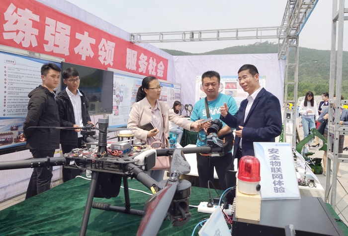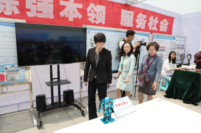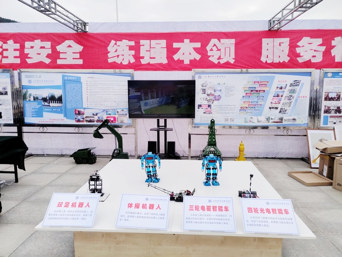 我校展位布置了学校宣传区、安全体验与展示、学生作品与展示、演示互动区四个区域。安全体验区布置了用电安全体验,建筑安全VR体验,安全物联网大数据展示等项目;作品展示区布置了学生美术作品、团扇等工艺品、先进制造加工件、焊接与热切割作品、无人机等;演示互动区布置了师生在淮海经济区第九届机器人大赛中获奖的机器人表演,双足机器人、体操机器人现场展示吸引了各界人士驻足询问�