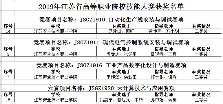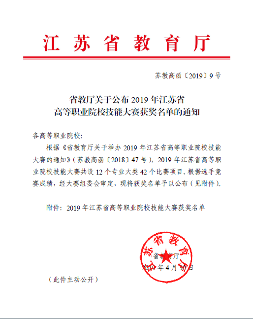 4�30日,江苏省教育厅印发了《关于公�2019年江苏省高等职业院校技能大赛获奖名单的通知》�