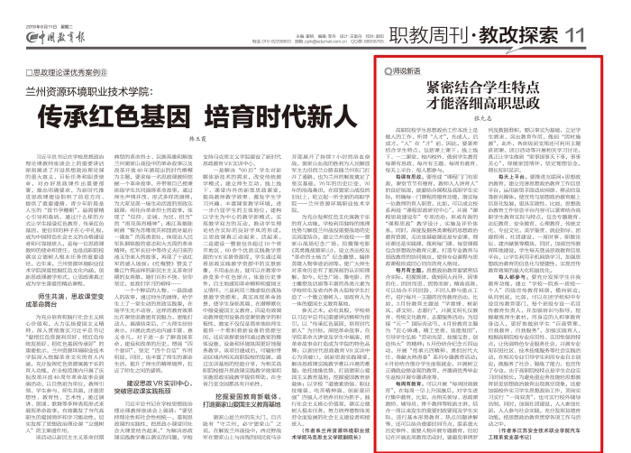 6月11日,《中国教育报》在第11版“职教周刊·教改探索”栏目刊发了我院汽车工程系党支部书记张允志同志的教育论文《紧密结合学生特点 才能落细高职思政》。