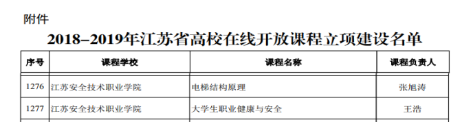 近日,江苏省教育厅传来喜讯,由我院教师王浩、张旭涛分别负责的《大学生职业健康与安全》《电梯结构原理》两门在线开放课程,予以立项建设�