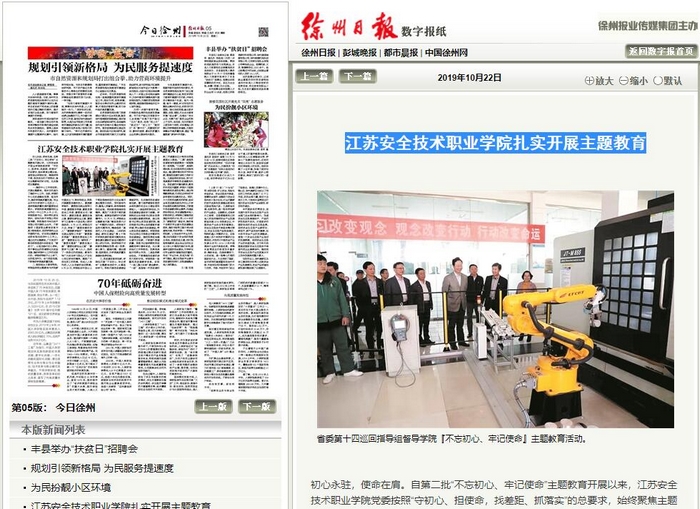 10�22日,《徐州日报》刊发了《江苏安全技术职业学院扎实开展主题教育》。原文链接: