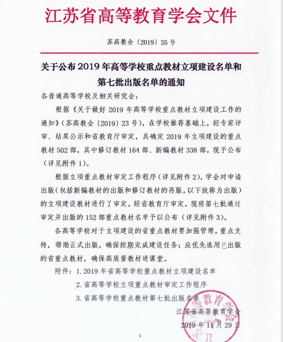 此项目是根据《关于做�2019年高等学校重点教材立项建设工作的通知》(苏高教会�2019�23号)文件精神,经学校申报、省高等教育学会组织专家评审,共遴选确定立项建设的重点教材502部,其中修订教材164部,新编教材338部�