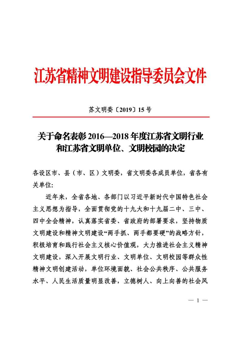 12月7日,江苏省精神文明建设指导委员会发布了《关于命名表彰2016—2018年度江苏省文明行业和江苏省文明单位、文明校园的决定》(苏文明委〔2019〕15号),授予我院2016-2018年度“江苏省文明校园”称号。