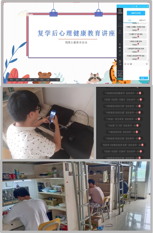 本届心理健康月的活动主题是?/span>逆境携行,你我同?/span>”,活动包括线上心理委员培训、全院学生心理健康测评、心理健康文章推送、心理健康主题教育讲座、线上个体心理辅导等。学工处心理健康中心老师讲解的心理健康常识以及常见心理问题的应对技巧等内容,为同学们带来了心灵的洗礼。各系高度重视,积极参与,依托专业特色开展了心理健康教育活动,在全院范围内形成了良好的心理健康教育氛围。信息工程系开展?/span>返校复学 从心开?/span>?/span>线下心理小活动,深受学生的喜爱;电气工程系结合专业特色,推送“做一个阳光明媚的少年”文章,语言活泼,内容积极向上,引导学生形成理性平和的心态?/span>