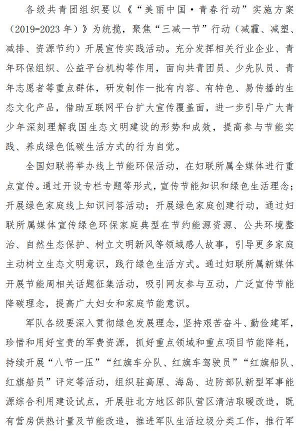 中直管理局,国务院有关部门,中央军委后勤保障部,全国妇联,有关社会团体,各省、自治区、直辖市及计划单列市、副省级省会城市、新疆生产建设兵团发展改革委、生态环境厅(局)、教育厅(教委、教育局)、科技厅(科委、科技局)、工业和信息化主管部门、住房和城乡建设厅(建委、建设交通委、建设局)、交通运输厅(局、委)、农业农村(农牧)厅(局、委)、商务主管部门、国资委、广电局、机关事务管理部门、总工会、团委,山西省能源局�
